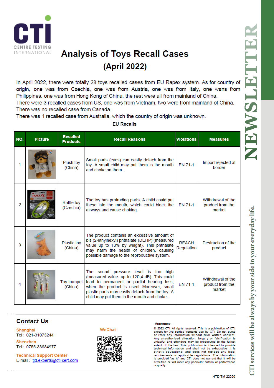 In April 2022, there were totally 28 toys recalled cases from EU Rapex system. As for country of origin, one was from Czechia, one was from Austria, one was from Italy, one wans from Philippines, one was from Hong Kong of China, the rest were all from mainland of China.