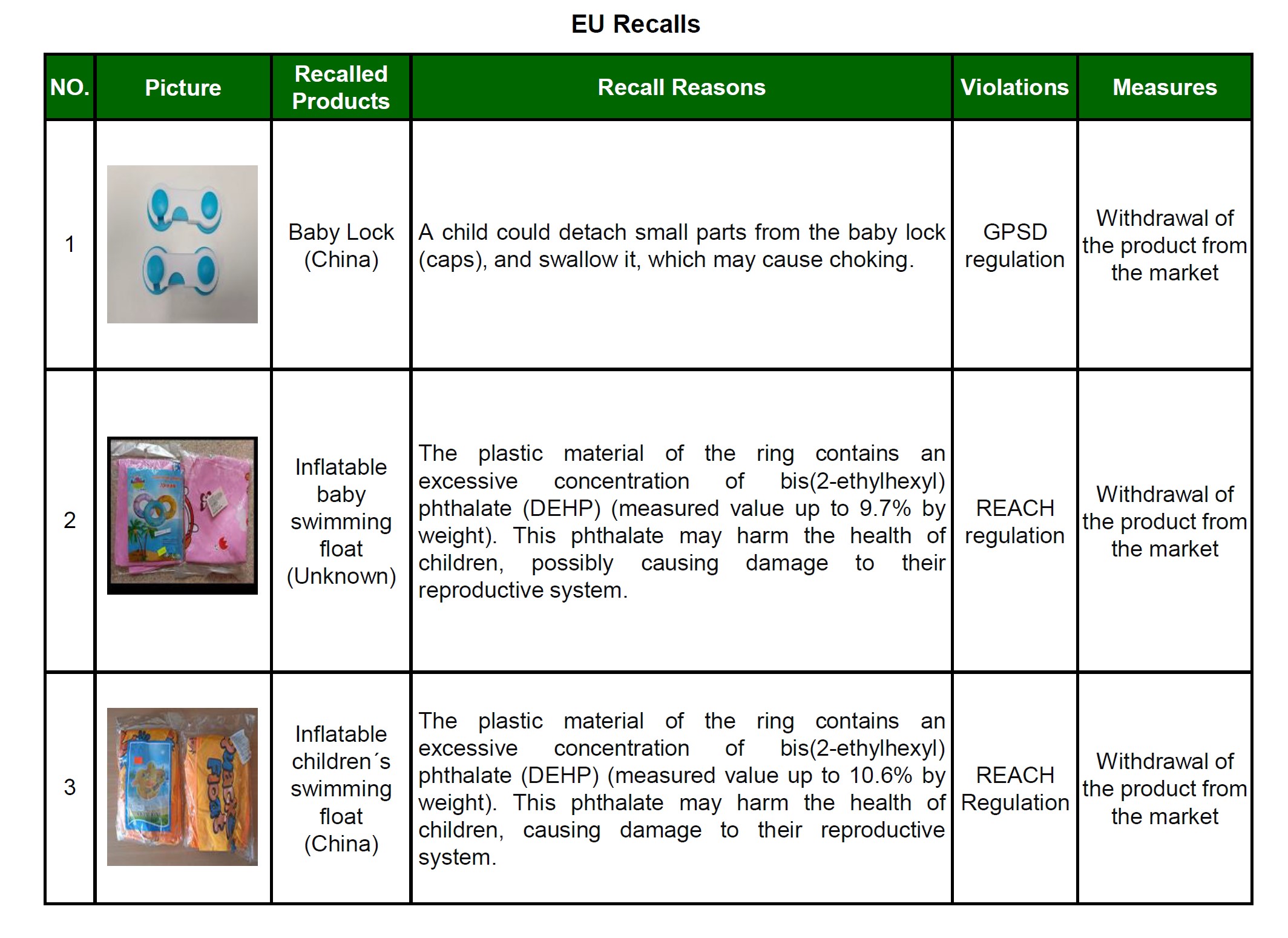 There were 3 products (inflatable baby swimming float, Pencil case) cases were recalled that contain excessive concentration of bis(2-ethylhexyl) phthalate (DEHP), this phthalate may harm the health f children, possibly causing damage to their reproductive system.