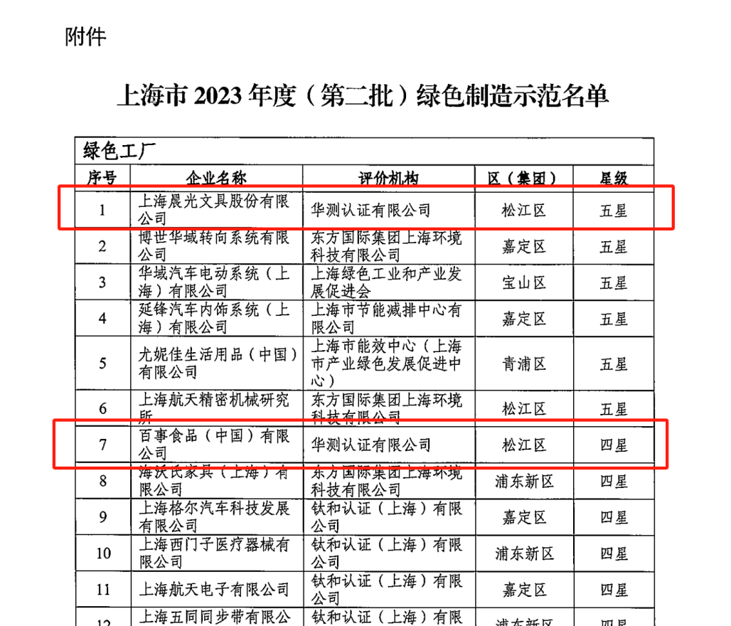 Recently, two companies evaluated by CTI Certification were selected into the list of 2023 Shanghai Green Factories. Among them, PepsiCo Foods (China) Co., Ltd. won the title of "Shanghai Four-Star Green Factory in 2023", and M&G STATIONERY Co., Ltd. won the title of "Shanghai Five-Star Green Factory in 2023".