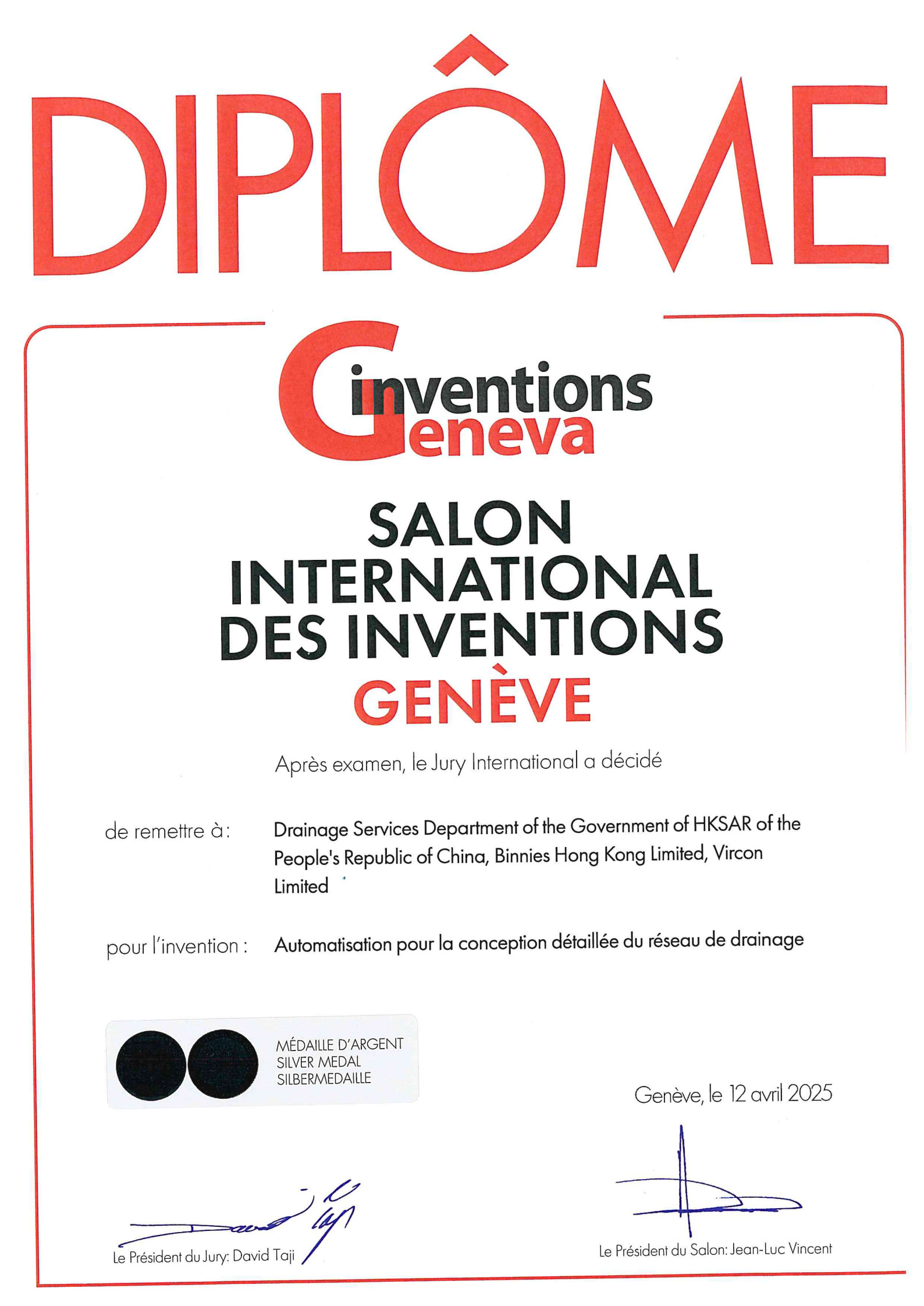 We are proud to announce that Drain Vision — Automation for Drainage Network Detailed Design co-developed by the Hong Kong Drainage Services Department, Binnies Hong Kong, and Vircon Limited (CTI BIM Services Team) — has been awarded the Silver Medal (Médaille d'Argent) at the 50th International Exhibition of Inventions Geneva.