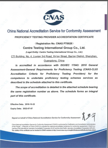CTI started its proficiency testing activities and the research and development of reference materials/standard samples in 2009. In July 2013, it obtained the proficiency testing provider (PTP number: PT0028) and the reference material producer (RMP number: RM0008) Two qualification certificates, becoming a domestic third-party testing organization that has obtained two accreditation qualifications at the same time; China Testing Standards Center, as a CTI testing organization specialized in the development of reference materials and proficiency verification activities, has successfully developed a variety of standards It has also obtained the national standard material certificate issued by the General Administration of Quality Supervision, Inspection and Quarantine of the People's Republic of China, and organized proficiency testing activities for many times, established a communication platform for the improvement of laboratory testing technology, and provided one-stop quality solutions for enterprises and industries.