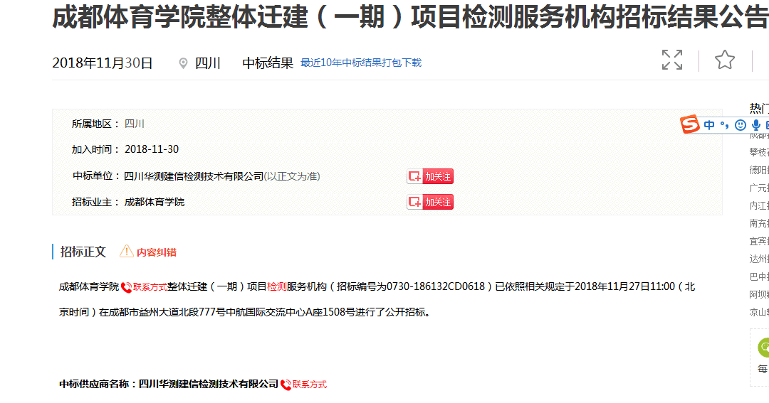 2018年11月30日,我公司憑借良好的信譽、行業(yè)經(jīng)驗、強大技術實力以及優(yōu)秀的團隊贏得了成都體育學院的一致肯定,成功中選成都體育學院整體遷建(一期)項目檢測服務。中選結果公示如下: