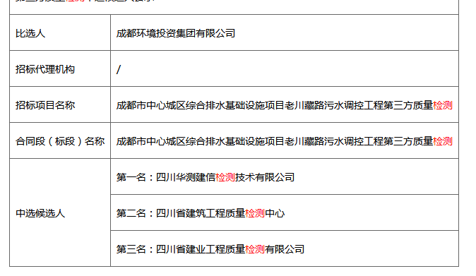 2018年6月7日,我公司憑借良好的信譽(yù)、行業(yè)經(jīng)驗(yàn)、強(qiáng)大技術(shù)實(shí)力以及優(yōu)秀的團(tuán)隊(duì)贏得了成都環(huán)境投資集團(tuán)有限公司的一致肯定,成功中選成都市中心城區(qū)綜合排水基礎(chǔ)設(shè)施項(xiàng)目老川藏路污水調(diào)控工程第三方質(zhì)量檢測。中選結(jié)果公示如下: