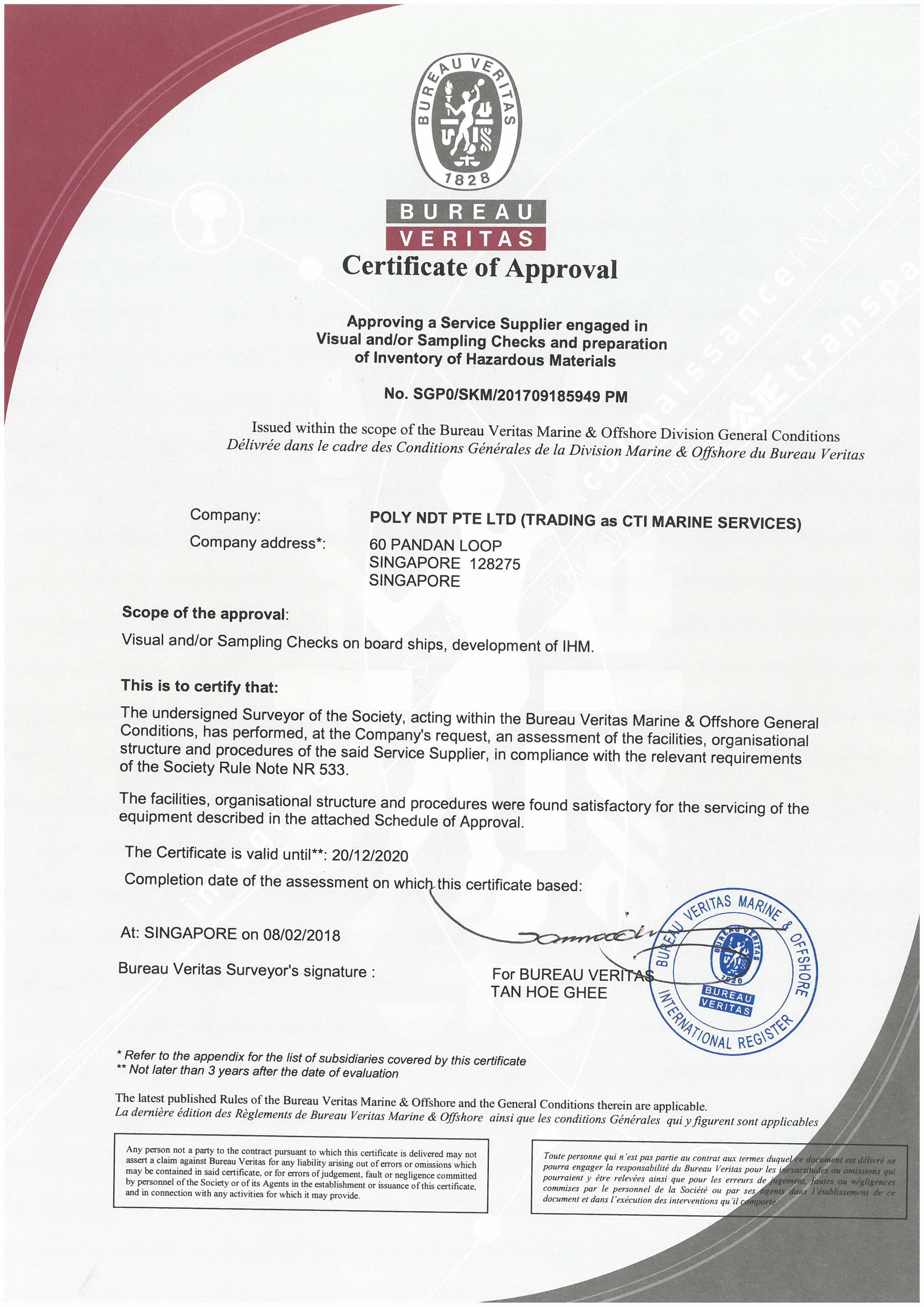 2018年2月8日,隸屬于CTI華測(cè)海事的新加坡Poly NDT公司,成為亞洲首家獲得BV船級(jí)社認(rèn)可的船舶有害物質(zhì)清單(IHM)服務(wù)的專家機(jī)構(gòu),也是全球?yàn)閿?shù)不多的能同時(shí)滿足香港拆船公約、歐盟拆船法規(guī)和有害物質(zhì)清單編制指南的專家機(jī)構(gòu)。