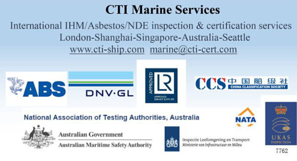 2016年4月5日,CTI華測海事服務(wù)的新加坡POLY NDT公司,順利通過了美國船級社(ABS)新加坡分部的審核,并榮獲ABS授予有害物質(zhì)清單(IHM)機(jī)構(gòu)認(rèn)可證書,此為ABS簽發(fā)的全球首張IHM機(jī)構(gòu)認(rèn)可證書。