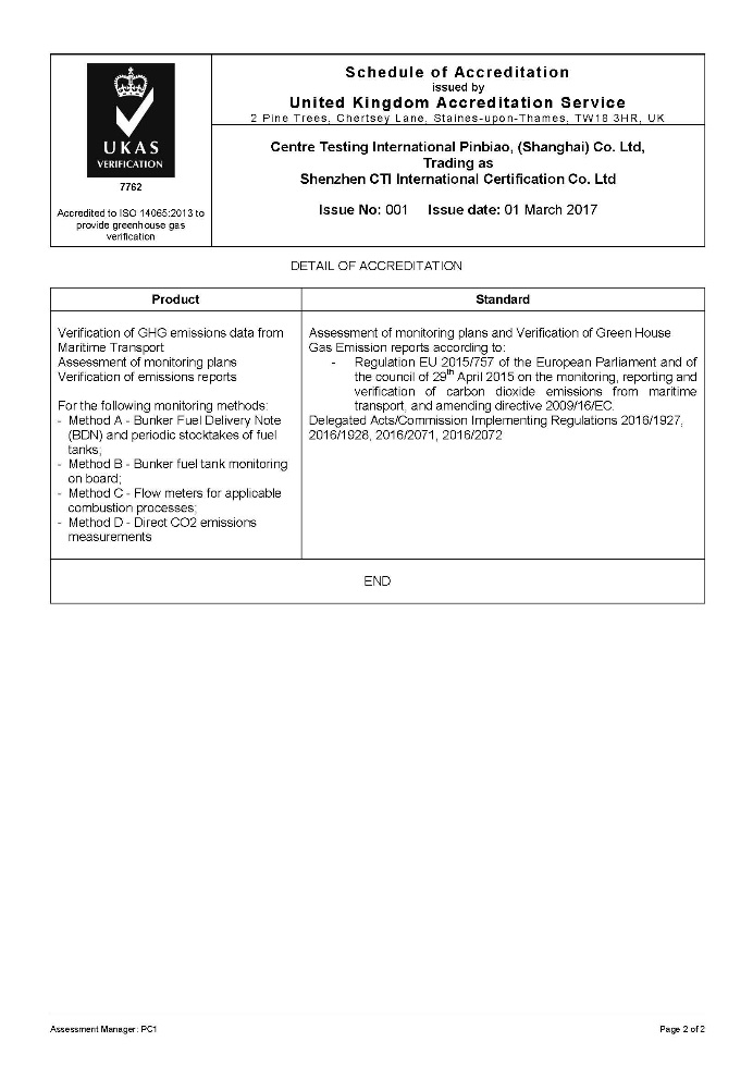 CTI的這個(gè)資質(zhì)是UKAS簽發(fā)的首張歐盟MRV認(rèn)可證書(編號(hào)001),是繼CTI于2012年獲得聯(lián)合國清潔發(fā)展機(jī)制(CDM)審核機(jī)構(gòu)資質(zhì)之后,在全球范圍溫室氣體審核領(lǐng)域內(nèi)的又一次重大突破。由此CTI成為了全球范圍內(nèi)第一梯隊(duì)能幫助航運(yùn)公司依據(jù)歐盟EU2015/757法規(guī)對(duì)船舶進(jìn)行溫室氣體排放監(jiān)測(cè)、報(bào)告、核查的符合性評(píng)估。