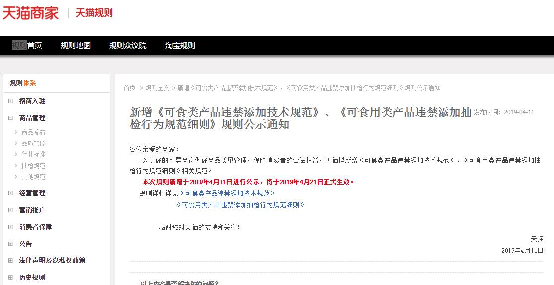 同時,配套發(fā)布的天貓《可食用類產(chǎn)品違禁添加抽檢行為規(guī)則細則》也同日起生效。一旦確認商品不符合該標準要求,天貓將據(jù)此對不合格產(chǎn)品做出下架、按規(guī)則處罰等處理,確保消費者安全網(wǎng)購。