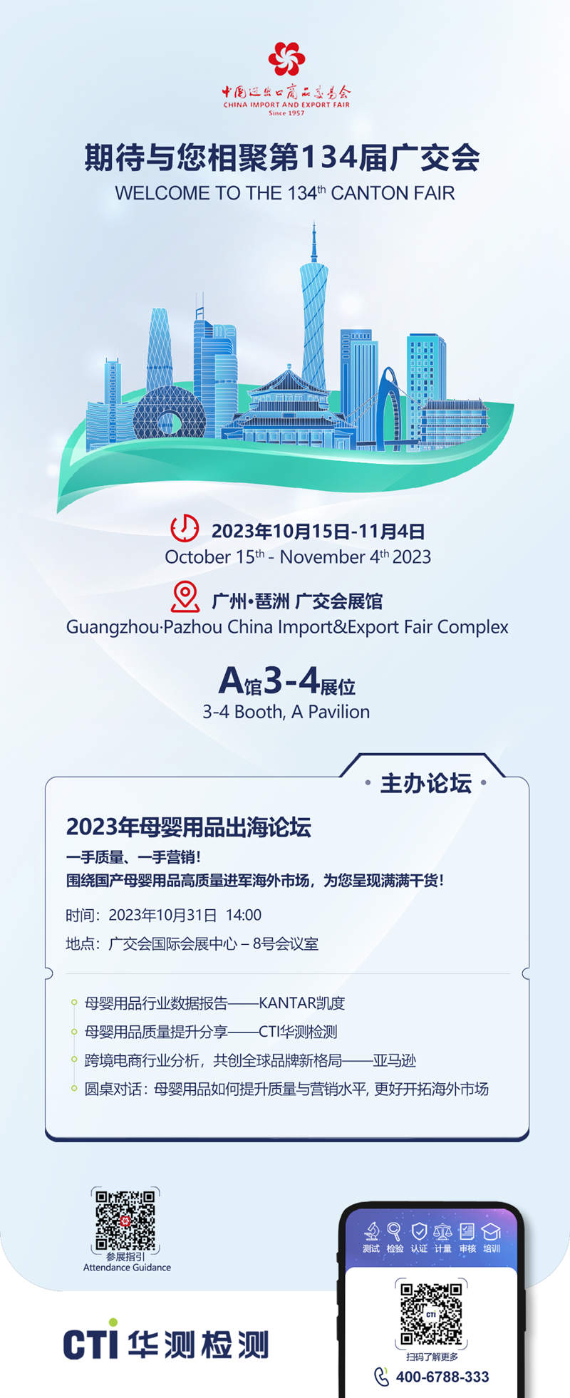 第134屆廣交會將于2023年10月15日開幕,CTI華測檢測作為廣交會長期合作伙伴,將繼續(xù)深度參與其中,歡迎廣大企業(yè)及服務(wù)商蒞臨交流,展位號:廣交會展館A區(qū)3-4柜臺。