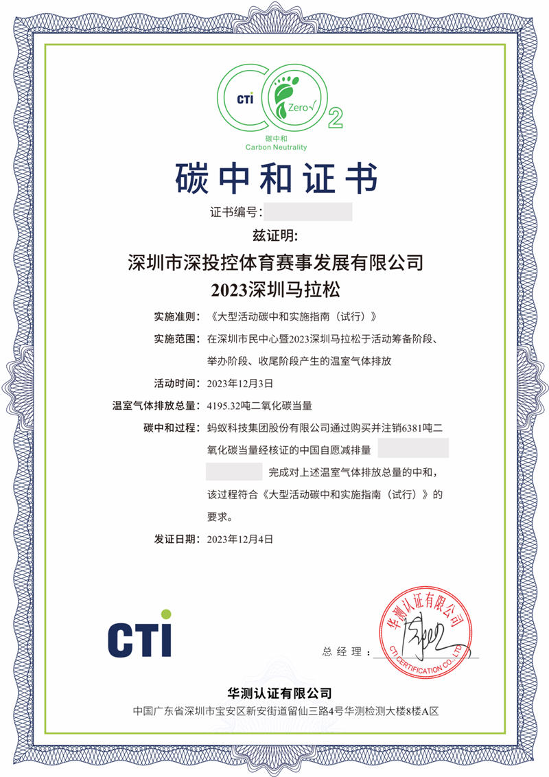 經(jīng)核查,2023深圳馬拉松總碳排放量為4195.32噸二氧化碳當(dāng)量,由螞蟻森林采購(gòu)并注銷碳信用量6381噸。注銷碳信用量大于實(shí)際碳排放量,故2023深圳馬拉松已實(shí)現(xiàn)碳中和,符合《大型活動(dòng)碳中和實(shí)施指南(試行)》的要求,CTI華測(cè)認(rèn)證為此次賽事頒發(fā)了碳中和證書(shū)。