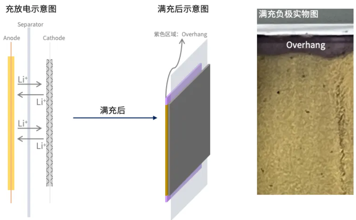 為了盡可能使較多的鋰離子嵌入到負(fù)極材料中,通常負(fù)極極片會(huì)比正極極片尺寸大一些,正負(fù)極未重合的區(qū)域稱(chēng)之為Overhang區(qū)域。
