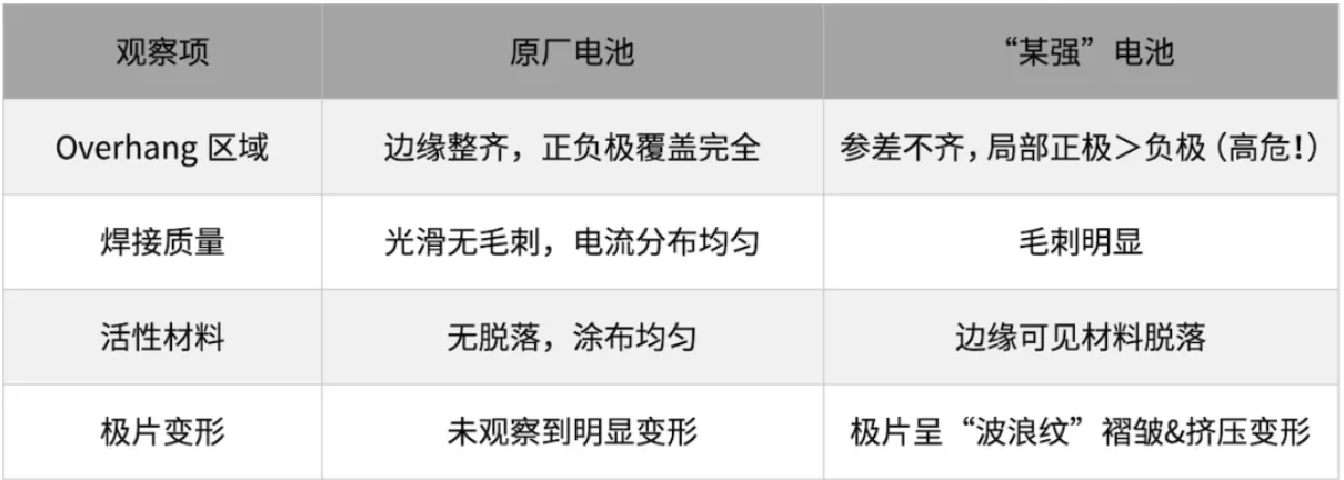 - “某強(qiáng)”電池存在“負(fù)Overhang”(正極超出負(fù)極),可能導(dǎo)致鋰金屬析出,刺穿隔膜引發(fā)短路。