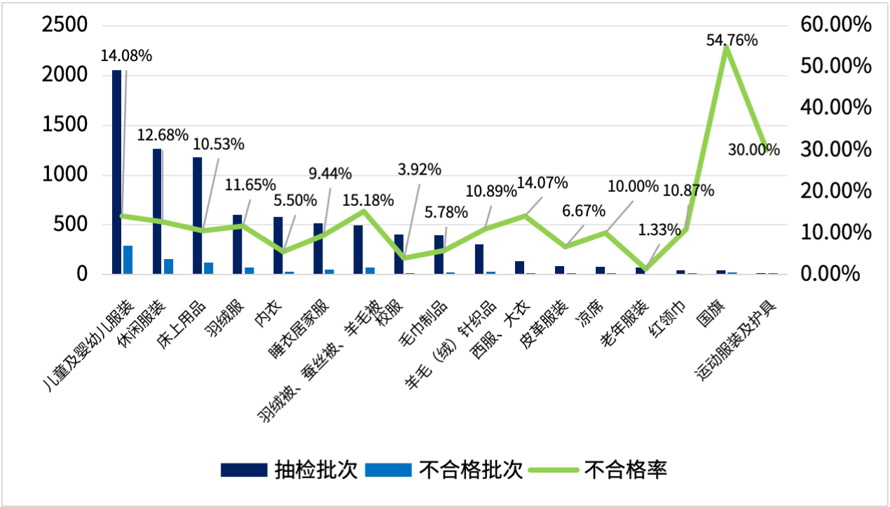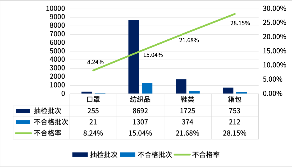 2025年1-6月紡織品鞋類產品線相關產品各品類抽檢批次及不合格情況見圖1。