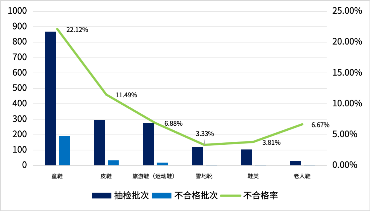 2025年1-6月,鞋類產品抽檢中,占比較高的品類分別是童鞋、皮鞋、旅游鞋(運動鞋)等;不合格率較高的品類同樣為童鞋、皮鞋、旅游鞋(運動鞋)。