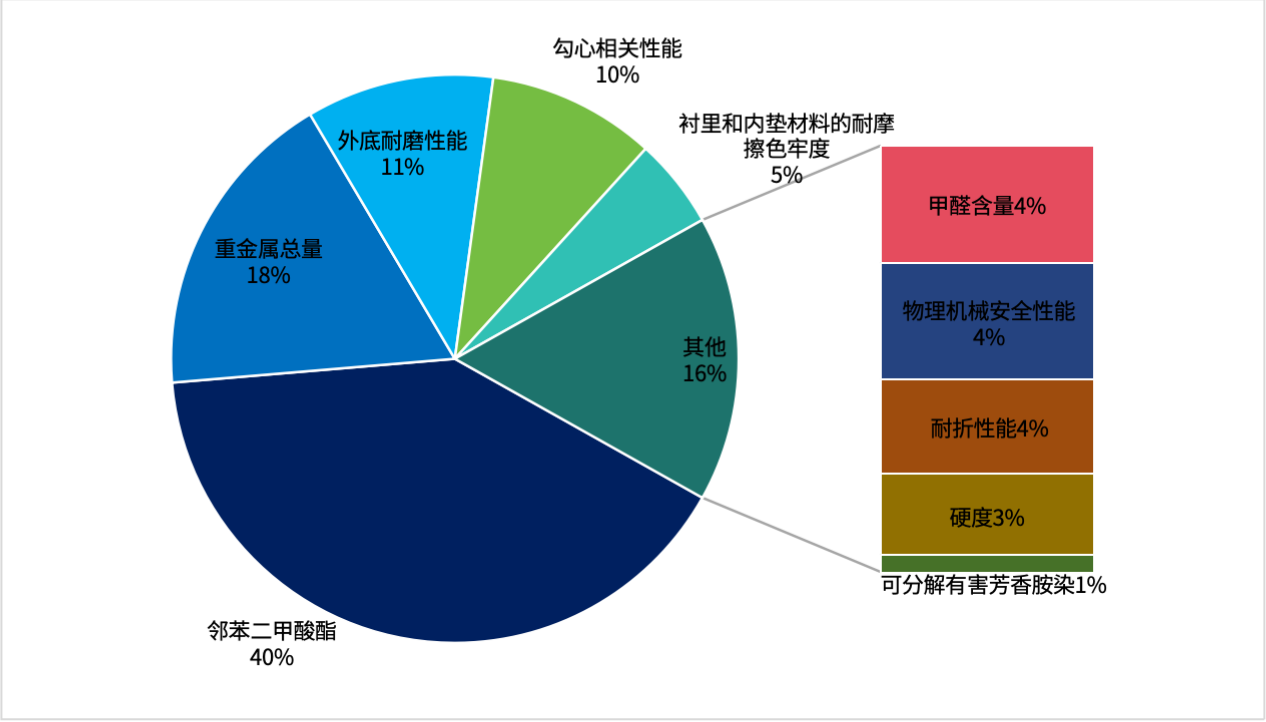 在鞋類產品的不合格項目中,占比最高的是鄰苯二甲酸酯、重金屬總含量,其次是外底耐磨性能及勾心硬度/長度等相關項目。