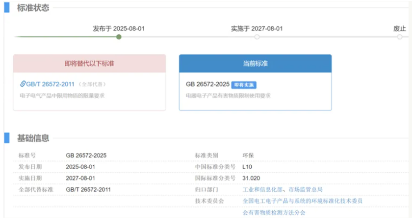 2025年8月1日,國家市場監(jiān)督管理總局(國家標(biāo)準(zhǔn)化管理委員會)正式批準(zhǔn)發(fā)布了《電器電子產(chǎn)品有害物質(zhì)限制使用要求》(GB 26572-2025)強(qiáng)制性國家標(biāo)準(zhǔn),標(biāo)準(zhǔn)將于2027年8月1日正式實施。本標(biāo)準(zhǔn)是中國RoHS管控領(lǐng)域第一個強(qiáng)制性國家標(biāo)準(zhǔn),標(biāo)準(zhǔn)的實施將進(jìn)一步深化電器電子產(chǎn)品中有害物質(zhì)的限制使用。