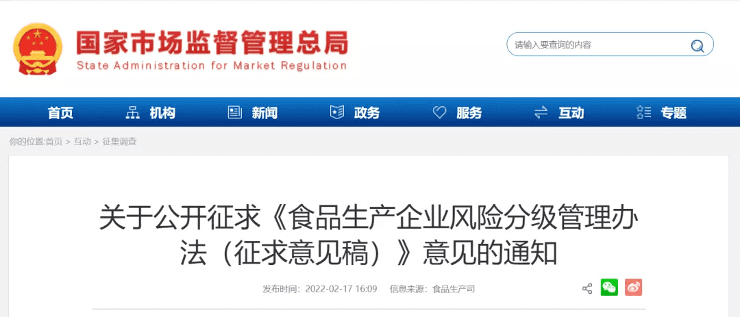 為推進(jìn)食品生產(chǎn)企業(yè)食品安全風(fēng)險(xiǎn)分級(jí)與信用風(fēng)險(xiǎn)分類管理,優(yōu)化監(jiān)管資源配置,提升監(jiān)管效能,市場(chǎng)監(jiān)管總局起草了《食品生產(chǎn)企業(yè)風(fēng)險(xiǎn)分級(jí)管理辦法(征求意見(jiàn)稿)》,現(xiàn)向社會(huì)公開(kāi)征求意見(jiàn)。公眾可通過(guò)以下途徑和方式提出意見(jiàn):