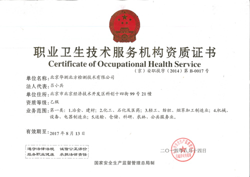 近日,北京華測北方檢測技術(shù)有限公司正式獲得北京市安全生產(chǎn)管理局頒發(fā)的職業(yè)衛(wèi)生技術(shù)服務(wù)資格證書,證書編號(京)安職技字(2014年)第B-0017號,自9月1日起正式為北京地區(qū)客戶提供職業(yè)衛(wèi)生技術(shù)服務(wù),服務(wù)的行業(yè)類別為:1、化工、石化及醫(yī)藥;2、輕工、紡織、煙草加工制造業(yè);3、機械、設(shè)備、電器制造業(yè);4、運輸、倉儲、科研、農(nóng)林、公共服務(wù)業(yè)。