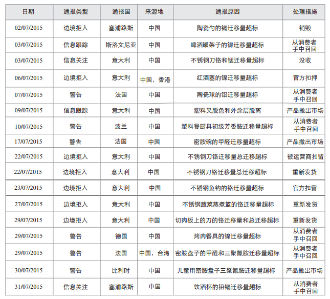 2015年7月歐盟食品 及飼料快速預(yù)警系統(tǒng)(RASFF)共對華通報(bào)食品接觸材料類產(chǎn)品抽檢不 合格案例17起。通報(bào)國成員有塞浦路斯、斯洛文尼亞、意大利、法國、 波蘭、德國和比利時(shí)。其中,餐廚具仍然為主要被通報(bào)的產(chǎn)品類型。本月被通報(bào)的產(chǎn)品主要是甲醛、三聚氰胺、鎘、鉛、鉻、鎳等的遷移量超標(biāo)。