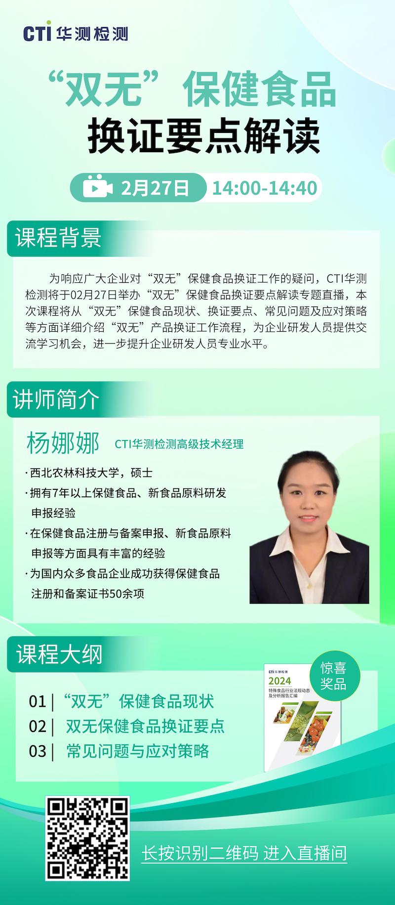 活動(dòng)背景:為響應(yīng)廣大企業(yè)對“雙無”保健食品換證工作的疑問,CTI華測檢測將于02月27日舉辦“雙無”保健食品換證要點(diǎn)解讀專題直播,本次課程將從“雙無”保健食品現(xiàn)狀、換證要點(diǎn)、常見問題及應(yīng)對策略等方面詳細(xì)介紹“雙無”產(chǎn)品換證工作流程,為企業(yè)研發(fā)人員提供交流學(xué)習(xí)機(jī)會,進(jìn)一步提升企業(yè)研發(fā)人員專業(yè)水平。