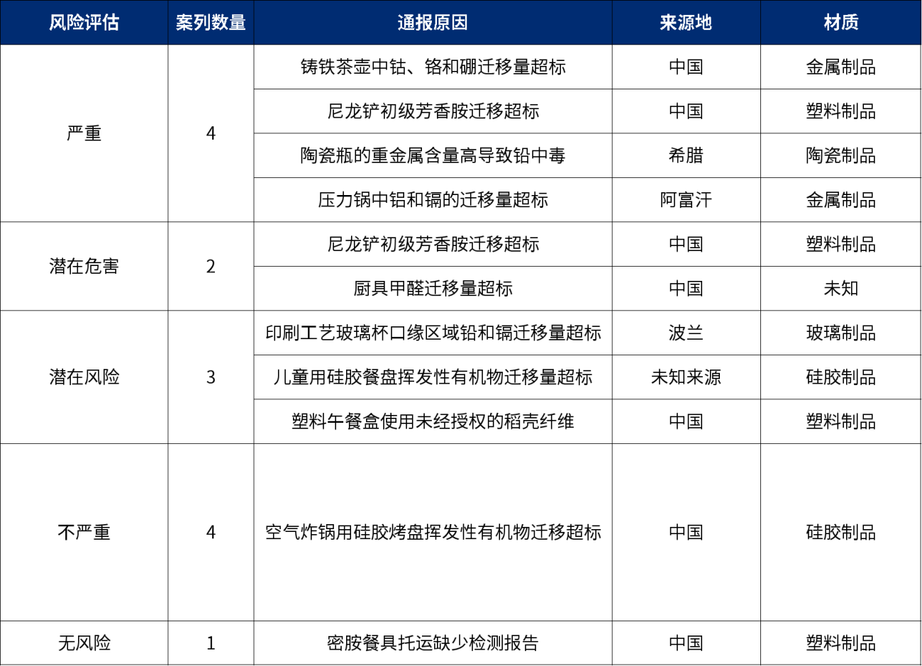 近期,歐盟食品及飼料快速預(yù)警系統(tǒng)(RASFF)通報(bào)食品接觸材料類產(chǎn)品抽檢不合格案例14起。其中來(lái)源于中國(guó)10起,阿富汗、波蘭、希臘各1起,未知來(lái)源1起。本期通報(bào)的案例當(dāng)中,違規(guī)原因主要是:揮發(fā)性有機(jī)物遷移超標(biāo)5起,重金屬遷移超標(biāo)4起,初級(jí)芳香胺遷移超標(biāo)2起,甲醛遷移超標(biāo)、產(chǎn)品使用未經(jīng)授權(quán)的植物纖維、產(chǎn)品缺少檢測(cè)報(bào)告各1起。