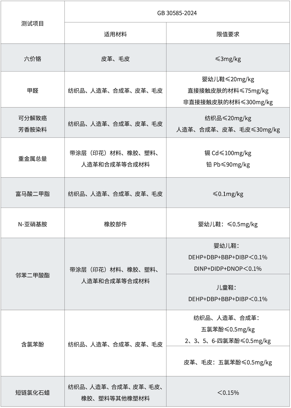 新版GB 30585—2024《童鞋安全技術(shù)規(guī)范》在預(yù)防“毒童鞋”的質(zhì)控方面,做出以下調(diào)整:鄰苯二甲酸酯中新增“DIBP”種類,提高六價鉻、重金屬總量(鉛)、鄰苯二甲酸酯限量要求、新增短鏈氯化石蠟、含氯苯酚檢測,并進一步明確了各項目的檢測材質(zhì)種類。