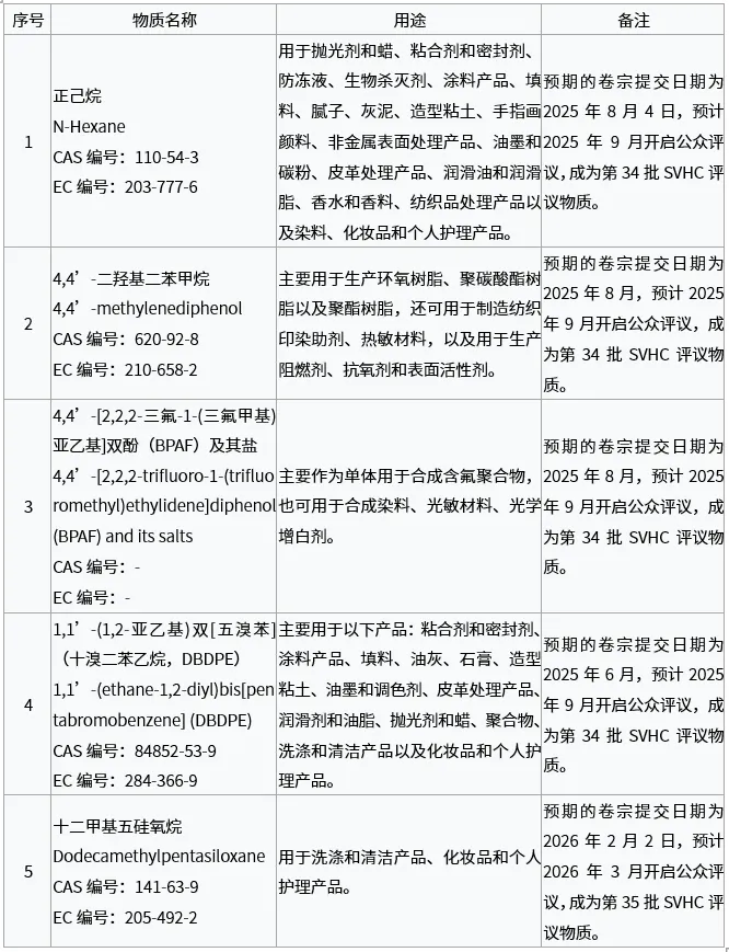 此前于2021年6月被提議列入SVHC清單的“間苯二酚(CAS編號:108-46-3)”仍處于待決定的狀態(tài),此次未被加入至清單。此外,目前關(guān)于SVHC的意向物質(zhì)共有5項(xiàng),預(yù)計(jì)將從2025年9月開始陸續(xù)開啟公眾評議。相關(guān)意向物質(zhì)如下: