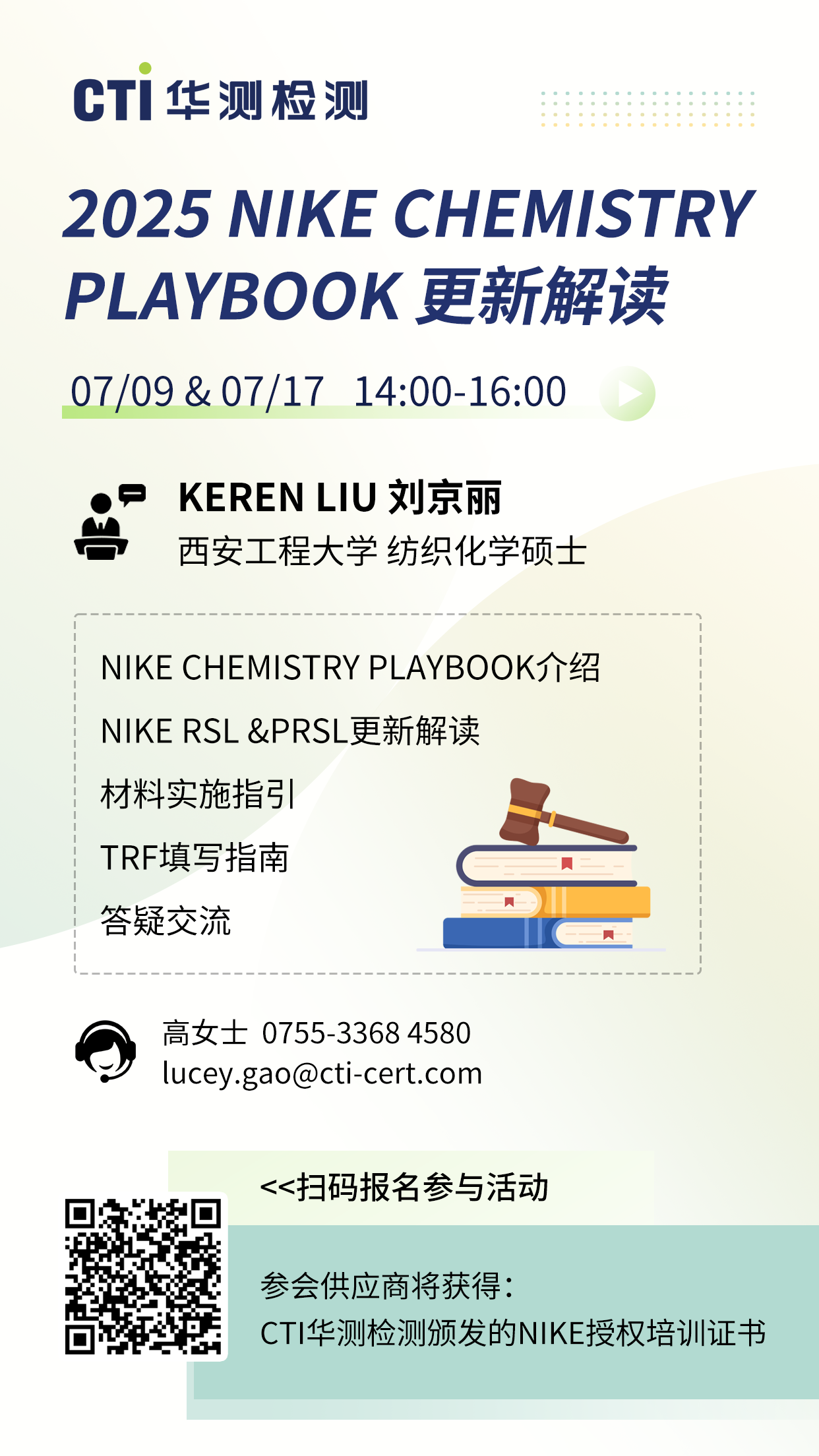 在這次研討會中,將于大家分享NIKE最新的2025 CHEMISTRY PLAYBOOK,同時會就限制物質(zhì)清單的變更內(nèi)容,材料最佳實施方案以及TRF填寫進行詳細介紹,期待您的參與。