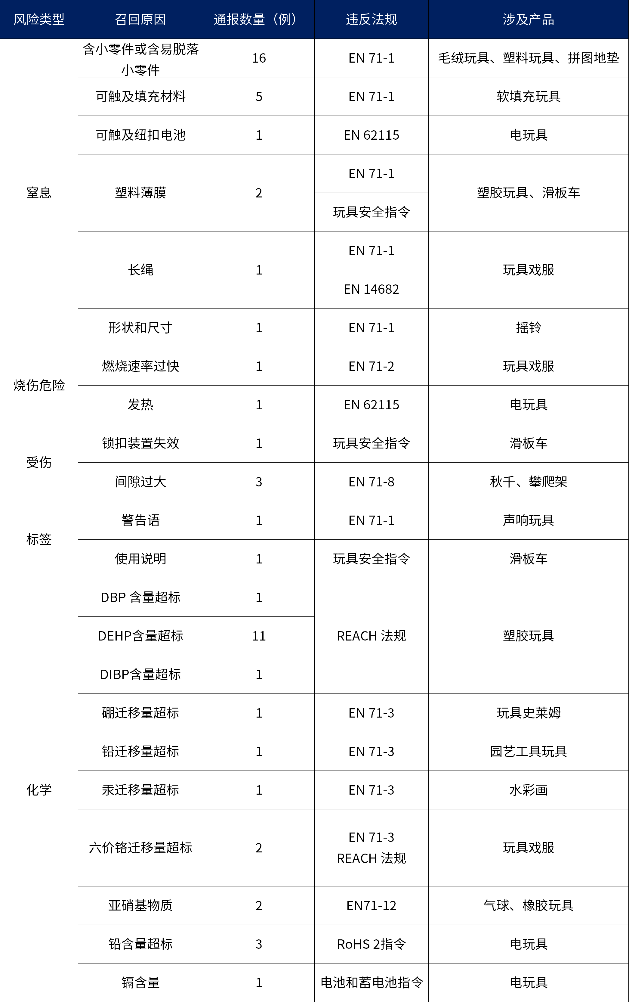 2025年5月,歐盟RAPEX系統(tǒng)共有50起玩具召回案例。1例來自保加利亞,1例來自匈牙利,1例來自波蘭,其余來自中國。其中,1例無線電遙控玩具車因不符合電池和蓄電池指令被召回。根據(jù)包裝信息,該產(chǎn)品的電池含有鎘。鎘會生物積累并對環(huán)境構(gòu)成風(fēng)險。此外,召回了1例水彩畫玩具套裝。該產(chǎn)品汞遷移量超標(biāo),違反了玩具EN 71-3標(biāo)準(zhǔn)要求。汞在兒童體內(nèi)積累,會損害腎臟、大腦和神經(jīng)系統(tǒng)。