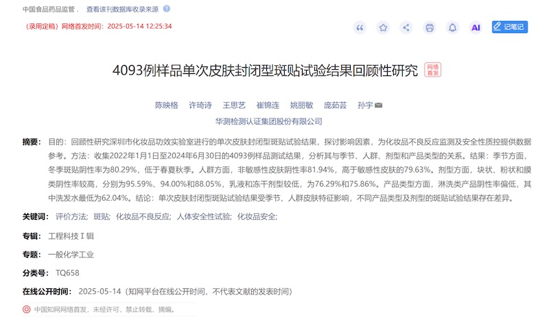 近日,CTI華測(cè)檢測(cè)化妝品功效實(shí)驗(yàn)室在國(guó)家藥品監(jiān)督管理局主管、中國(guó)健康傳媒集團(tuán)主辦的《中國(guó)食品藥品監(jiān)管》期刊發(fā)表《4093例樣品單次皮膚封閉型斑貼試驗(yàn)結(jié)果回顧性研究》,通過(guò)對(duì)大量實(shí)測(cè)數(shù)據(jù)的系統(tǒng)分析,為行業(yè)提供了重要的安全性參考依據(jù)。