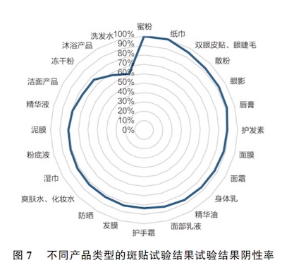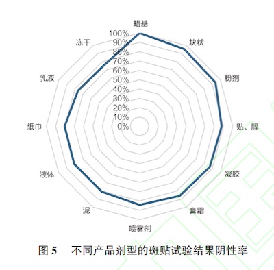 化妝品的配方組成、產(chǎn)品劑型與其安全性直接相關(guān)。既往的化妝品不良反應(yīng)監(jiān)測(cè)報(bào)告,報(bào)告的不良反應(yīng)案例數(shù)受到產(chǎn)品使用人群數(shù)量、市場(chǎng)覆蓋面以及數(shù)量的影響。研究中揭示了不同劑型產(chǎn)品在安全性表現(xiàn)上的顯著差異,對(duì)產(chǎn)品類(lèi)型內(nèi)部的斑貼試驗(yàn)陰性率進(jìn)行統(tǒng)計(jì)分析,可以盡可能減少上述影響評(píng)估該類(lèi)別產(chǎn)品配方的安全性風(fēng)險(xiǎn)。其中,塊狀和粉狀劑型表現(xiàn)出最高的安全性(陰性率>94%),而乳液和凍干劑型的陰性率相對(duì)較低(76.29%和75.86%)。特別值得關(guān)注的是淋洗類(lèi)產(chǎn)品,尤其是洗發(fā)水的陰性率最低(62.04%),這可能歸因于其配方中表面活性劑含量較高。