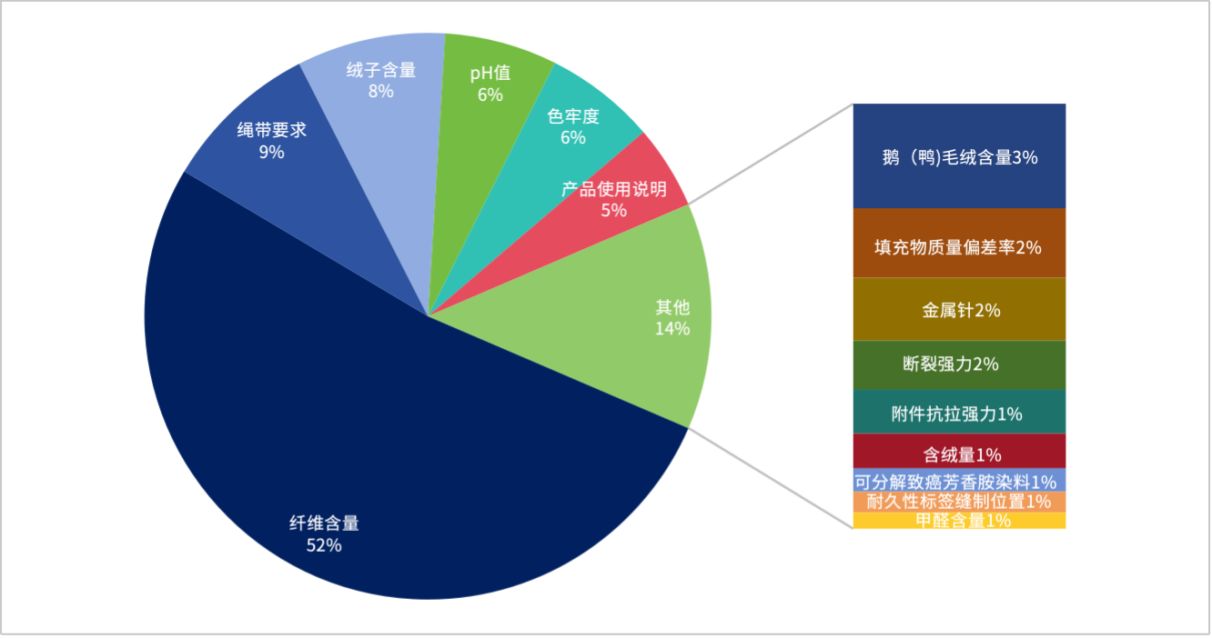 在服裝及配飾類產(chǎn)品的不合格項(xiàng)目中,占比最高的是纖維含量,其次是繩帶要求、絨子含量、pH值以及色牢度。