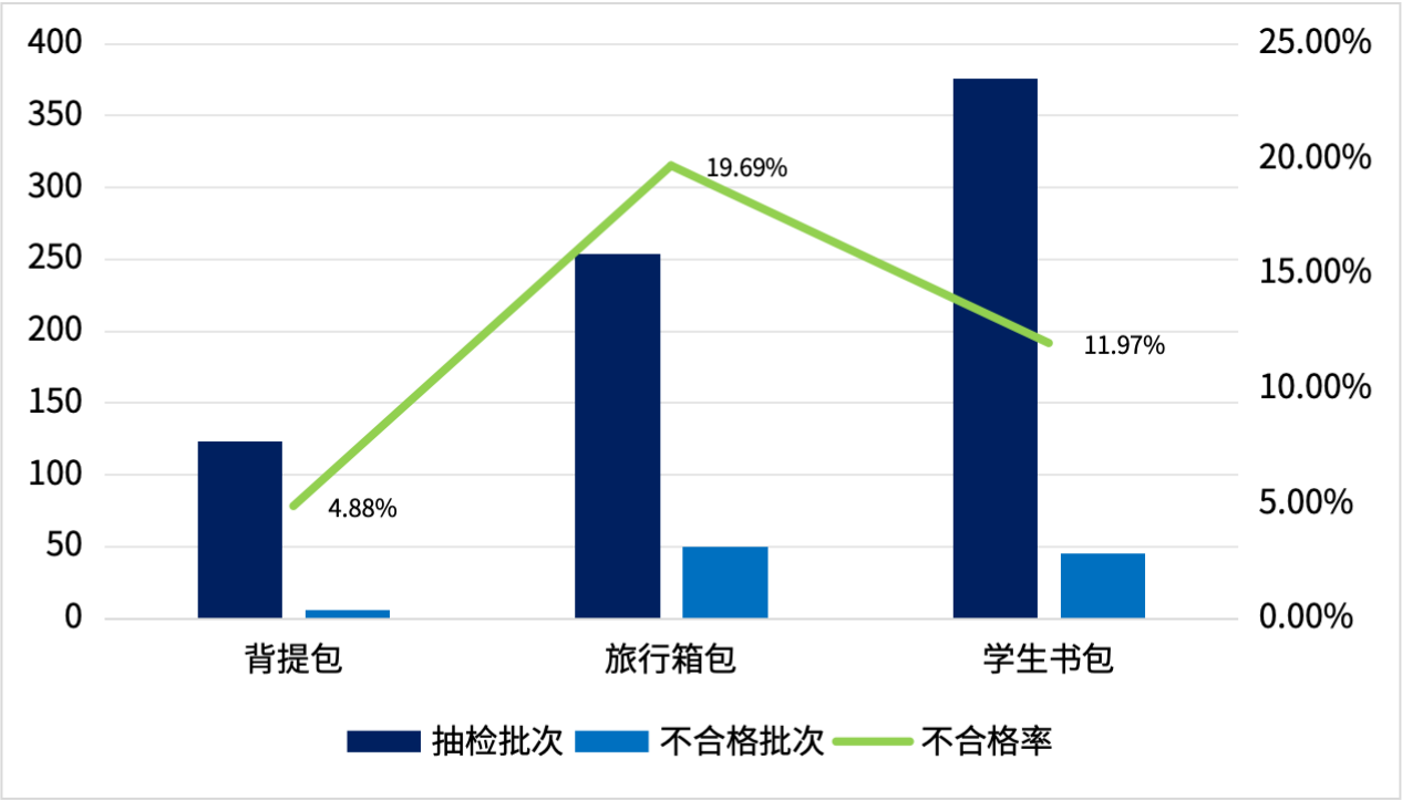 2025年1-6月,箱包產(chǎn)品抽檢中,占比較高的品類分別是學(xué)生書包、旅行箱包;不合格率較高的品類同樣是旅行箱包、學(xué)生書包。
