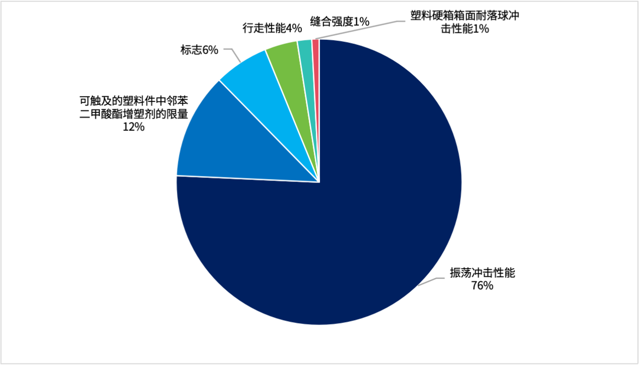 在箱包產(chǎn)品的不合格項(xiàng)目中,占比最高的是振蕩沖擊性能,其次是可觸及塑料件中鄰苯二甲酸酯增塑劑的限量。