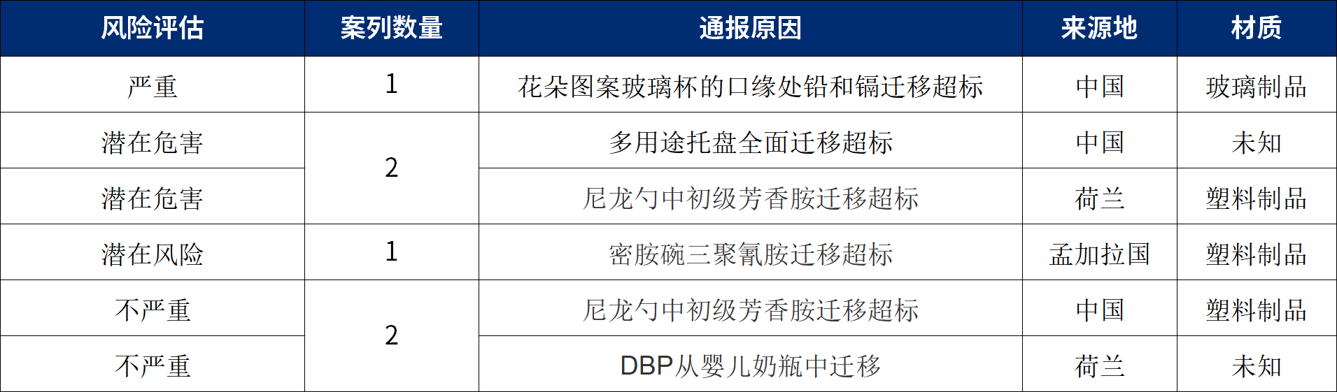 近期,歐盟食品及飼料快速預警系統(tǒng)(RASFF)通報食品接觸材料類產品抽檢不合格案例6起。其中來源于中國3起,荷蘭2起,孟加拉國1起。本期通報的案例當中,違規(guī)原因主要是:初級芳香胺遷移超標2起,全面遷移超標、重金屬遷移超標、增塑劑遷移超標、三聚氰胺遷移超標各1起。