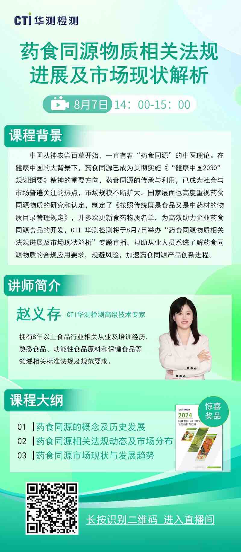 中國從神農(nóng)嘗百草開始,一直有著“藥食同源”的中醫(yī)理論。在健康中國的大背景下,藥食同源已成為貫徹實(shí)施《“健康中國2030”規(guī)劃綱要》精神的重要方向,藥食同源的傳承與利用,已成為社會與市場普遍關(guān)注的熱點(diǎn),市場規(guī)模不斷擴(kuò)大。國家層面也高度重視藥食同源物質(zhì)的研究和認(rèn)定,制定了《按照傳統(tǒng)既是食品又是中藥材的物質(zhì)目錄管理規(guī)定》,并多次更新食藥物質(zhì)名單,為高效助力企業(yè)藥食同源食品的開發(fā),CTI華測檢測將于8月7日舉辦“藥食同源物質(zhì)相關(guān)法規(guī)進(jìn)展及市場現(xiàn)狀解析”專題直播,幫助從業(yè)人員系統(tǒng)了解藥食同源物質(zhì)的合規(guī)應(yīng)用要求,規(guī)避風(fēng)險,加速藥食同源產(chǎn)品創(chuàng)新進(jìn)程。