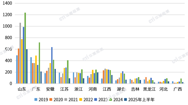 將2024年備案數(shù)量大于50款的省、直轄市列為2025年上半年分析的重點(diǎn)區(qū)域(共12個(gè)),分別是山東省、廣東省、安徽省、江蘇省、浙江省、河南省、江西省、湖北省、吉林省、黑龍江省、河北省、廣西省。總體來(lái)說(shuō),山東省2025上半年備案數(shù)量已接近2024年山東省全年備案產(chǎn)品數(shù)量的一半,相似的趨勢(shì)同樣出現(xiàn)在安徽省、江西省、吉林省、河北省等。
