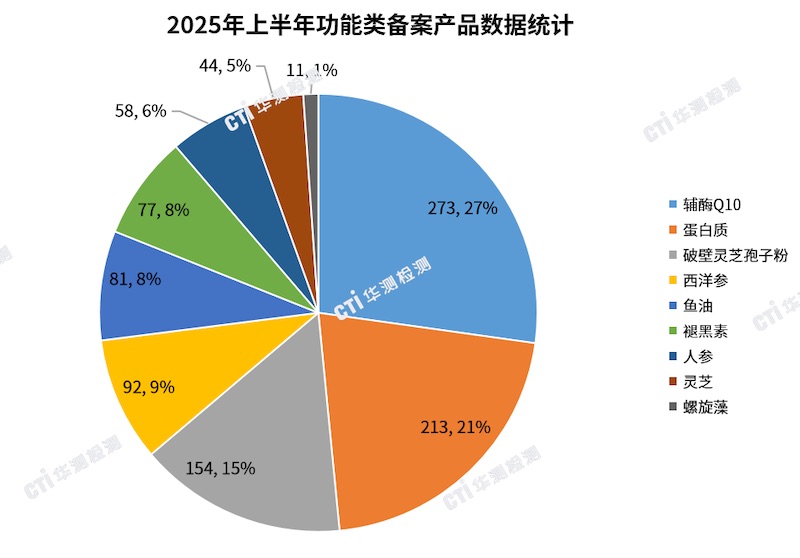 如圖3所示,2025上半年31個(gè)下轄省級(jí)行政區(qū)共獲批1003款功能性保健食品備案產(chǎn)品,其中輔酶Q10備案的新產(chǎn)品數(shù)量最多,共273款,占功能性保健食品備案總數(shù)的27%,其次是蛋白質(zhì)(213款,21%)和破壁靈芝孢子粉(154款,15%)。