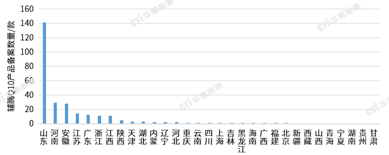 如圖4所示,對(duì)31個(gè)下轄省級(jí)行政區(qū)的輔酶Q10備案產(chǎn)品數(shù)量進(jìn)行分析,共273款,其中數(shù)量排行前三分別是山東省(141款)、河南省(29款)、安徽省(28款)。有23個(gè)省/直轄市在上半年獲批了輔酶Q10備案新產(chǎn)品,其余8個(gè)省、直轄市、自治區(qū)未獲批。