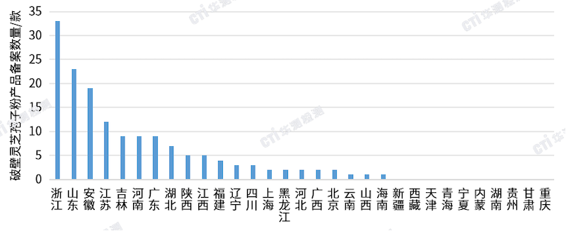 如圖6所示,2025上半年破壁靈芝孢子粉備案產(chǎn)品共154款,備案數(shù)量排名前三依次是浙江省(33款)、山東省(23款)、安徽省(19款),有21個(gè)省/直轄市在上半年獲批了破壁靈芝孢子粉備案新產(chǎn)品,其余10個(gè)省、直轄市、自治區(qū)未獲批。