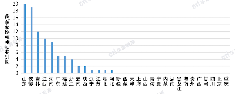 如圖7所示,2025上半年西洋參備案產(chǎn)品共92款,備案數(shù)量排名前三依次是山東省(20款)、安徽省(19款)、吉林省(12款),有14個(gè)省/直轄市在上半年獲批了西洋參備案新產(chǎn)品,其余17個(gè)省、直轄市、自治區(qū)未獲批。