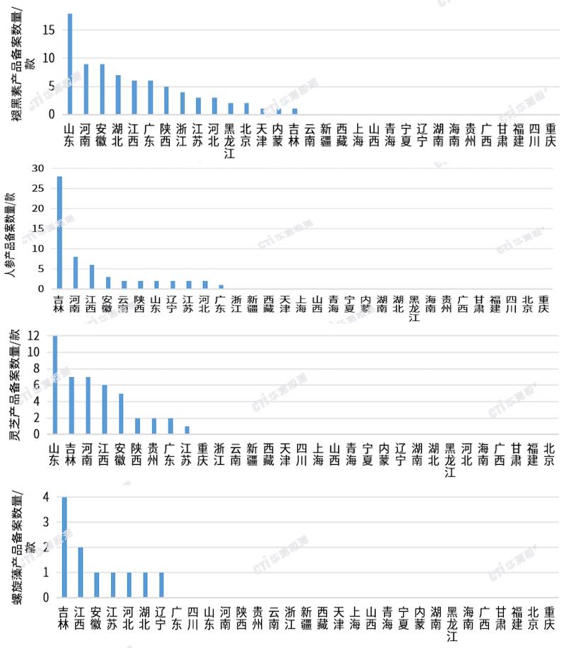其中,褪黑素備案數(shù)量排名前三依次是山東?。?8款)、河南?。?款)、安徽?。?款);人參備案數(shù)量排名前三依次是吉林?。?8款)、河南?。?款)、江西?。?款);靈芝備案數(shù)量排名前三依次是山東省(12款)、吉林省(7款)、河南省(7款);螺旋藻備案數(shù)量排名前三依次是吉林省(4款)、江西省(2款)、安徽省(1款)。