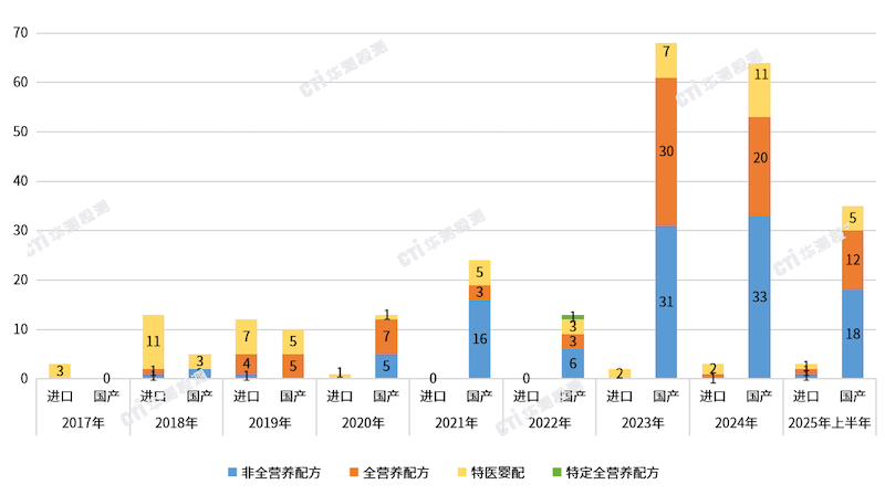 自2017年首款特醫(yī)食品獲批以來,每年均有產(chǎn)品獲批,在2023年注冊數(shù)量達到峰值,并在2024年保持穩(wěn)定。2025上半年有38款特醫(yī)食品獲批,已超過24年總獲批數(shù)量的一半,繼續(xù)延續(xù)了23年以來形成的較高獲批數(shù)量趨勢水平。