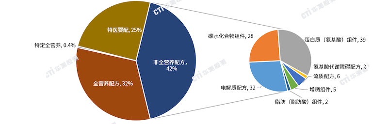 如圖3所示,以2017年至2025年6月底的特醫(yī)食品總數(shù)(269款)為基數(shù)進行分析,數(shù)據(jù)顯示非全營養(yǎng)配方食品目前占比最大,為42%,其余依次是全營養(yǎng)配方食品(32%)、特醫(yī)嬰配食品(25%)、特定全營養(yǎng)食品(0.4%)。其中,非全營養(yǎng)配方食品包括蛋白質(zhì)(氨基酸)組件(39款)、電解質(zhì)配方(32款)、碳水化合物組件(28款)、流質(zhì)配方(6款)、增稠組件(5款)、脂肪(脂肪酸)組件(2款)、氨基酸代謝障礙配方(2款)。