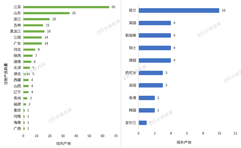 截止2025上半年,境內(nèi)地區(qū)已經(jīng)注冊232款特醫(yī)食品,其中江蘇省、山東省、浙江省位居國內(nèi)地區(qū)各省排行前三,分別為65款、35款和20款。境外地區(qū)成功注冊的產(chǎn)品目前為37款,其中荷蘭位居第一,為10款。