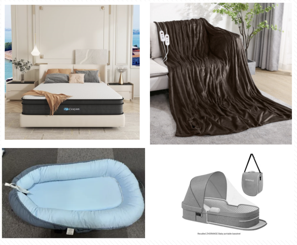 1例為嬰兒床中床側(cè)面高度低于安全圍擋最低限值,無法有效防護(hù)嬰兒;其睡墊厚度超過最大限制,存在窒息風(fēng)險(xiǎn),且嬰兒可能從床尾的開放區(qū)域跌落或被卡住。此外,該產(chǎn)品未配備支架,導(dǎo)致嬰兒造成跌落風(fēng)險(xiǎn)。這些違規(guī)情況構(gòu)成不安全的嬰兒睡眠環(huán)境,可能導(dǎo)致嬰兒重傷甚至死亡,因此違反聯(lián)邦嬰兒睡眠產(chǎn)品安全標(biāo)準(zhǔn)。