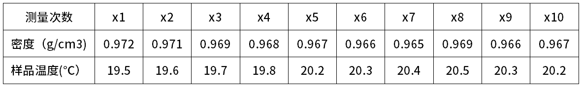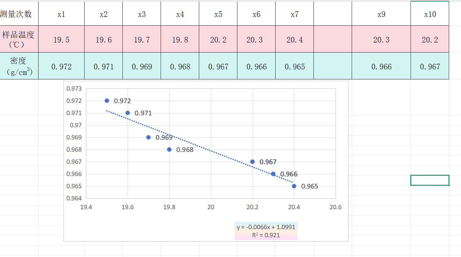 第一步,我們在滿足檢測方法要求的實驗室環(huán)境下(假設(shè)為20℃±0.5℃)對樣品的密度進(jìn)行了10次重復(fù)測量,將其密度測量結(jié)果及測量密度時的樣品溫度輸入Excel電子表格中如下表: