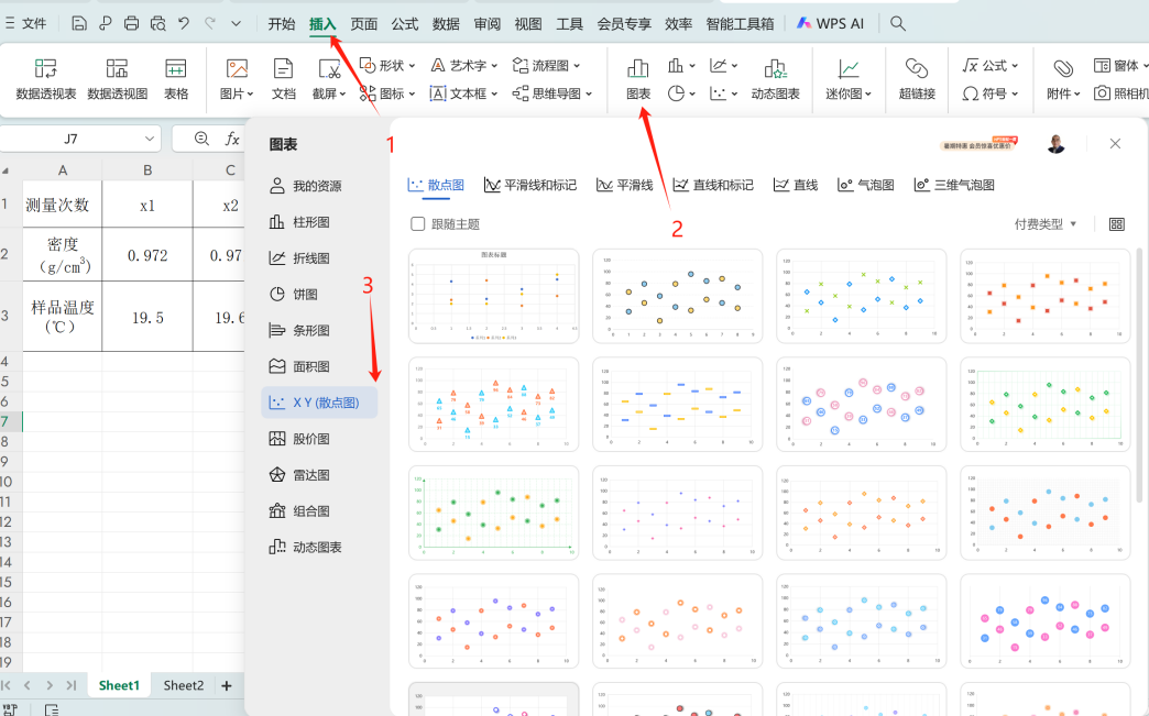 第二步,選中兩行數(shù)據(jù)后插入一個散點(diǎn)圖,步驟如下: