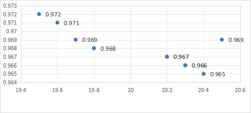 第五步,此時我們發(fā)現(xiàn)R平方值為0.6171,按照統(tǒng)計原理,R平方值小于0.8時,兩數(shù)組間的相關(guān)性較弱,說明檢測結(jié)果不符合正常的物理特性趨勢,也就是其中存在異常的檢測結(jié)果,我們觀察散點(diǎn)圖上的數(shù)據(jù)分布后發(fā)現(xiàn),右側(cè)的0.969這個密度數(shù)據(jù)偏離趨勢曲線較嚴(yán)重,對應(yīng)的檢測結(jié)果是x8,因此嘗試刪除此組檢測結(jié)果后再觀察曲線狀態(tài),結(jié)果如下圖: