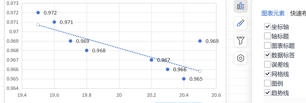 第三步,用鼠標(biāo)左鍵點(diǎn)擊散點(diǎn)圖空白處后顯示了右邊的彈出菜單,選擇菜單中圖表元素,將“趨勢線”選中,就會顯示出如下圖中的數(shù)據(jù)趨勢線: