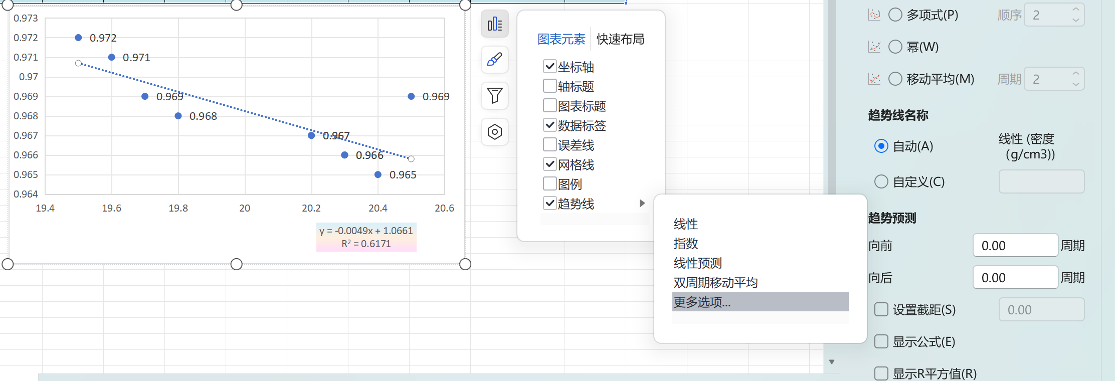 第四步,在右邊彈出菜單的趨勢線右邊選中第二級下拉菜單,再選擇“更多選項”,此時出現(xiàn)了右邊欄,勾選右下角的“顯示公式”、“顯示R平方值”,此時圖中就會顯示出曲線的斜率和截距以及R2值,如下圖: